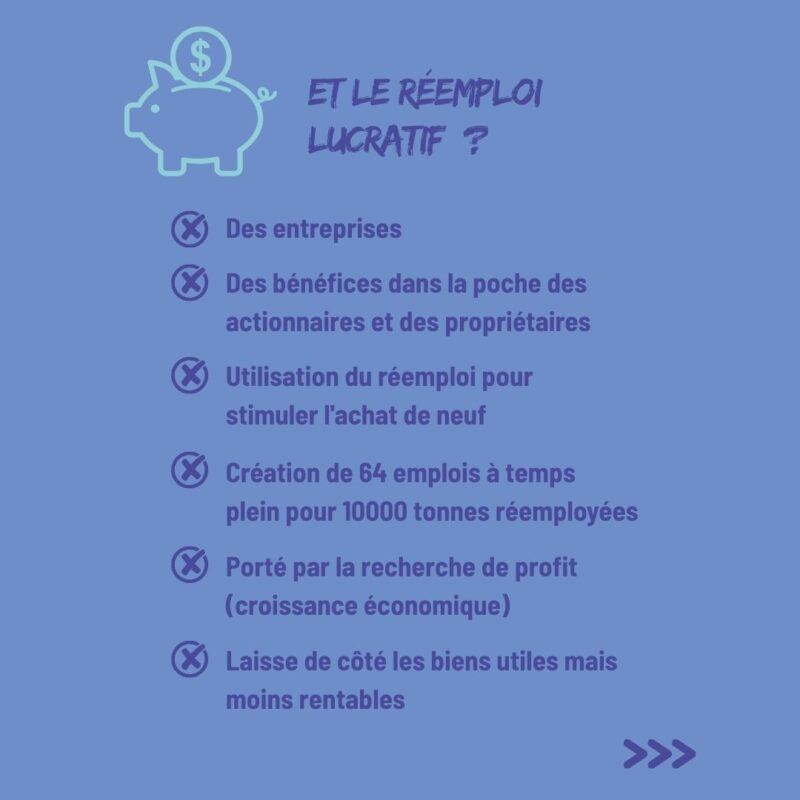 👉 Dans le réemploi lucratif, on est (toujours et encore) dans une logique mercantile où les objets sont sélectionnés selon leur rentabilité.